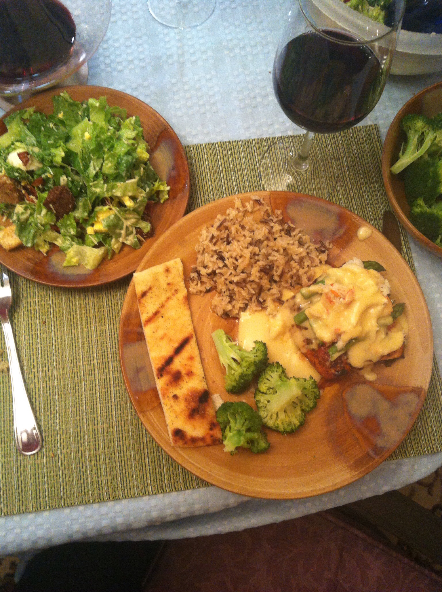 For dinner that evening we had another really yummy homemade meal. This one was a blackened salmon oscar with asparagus, crab and hollandaise sauce along with wild rice, broccoli and a caesar salad that had hard boiled eggs and bacon. This was of course paired with some delicious wine, an Artesa Pinot Noir and a Katherine Hall Cabernet Sauvignon. Not bad for my last San Fran dinner!